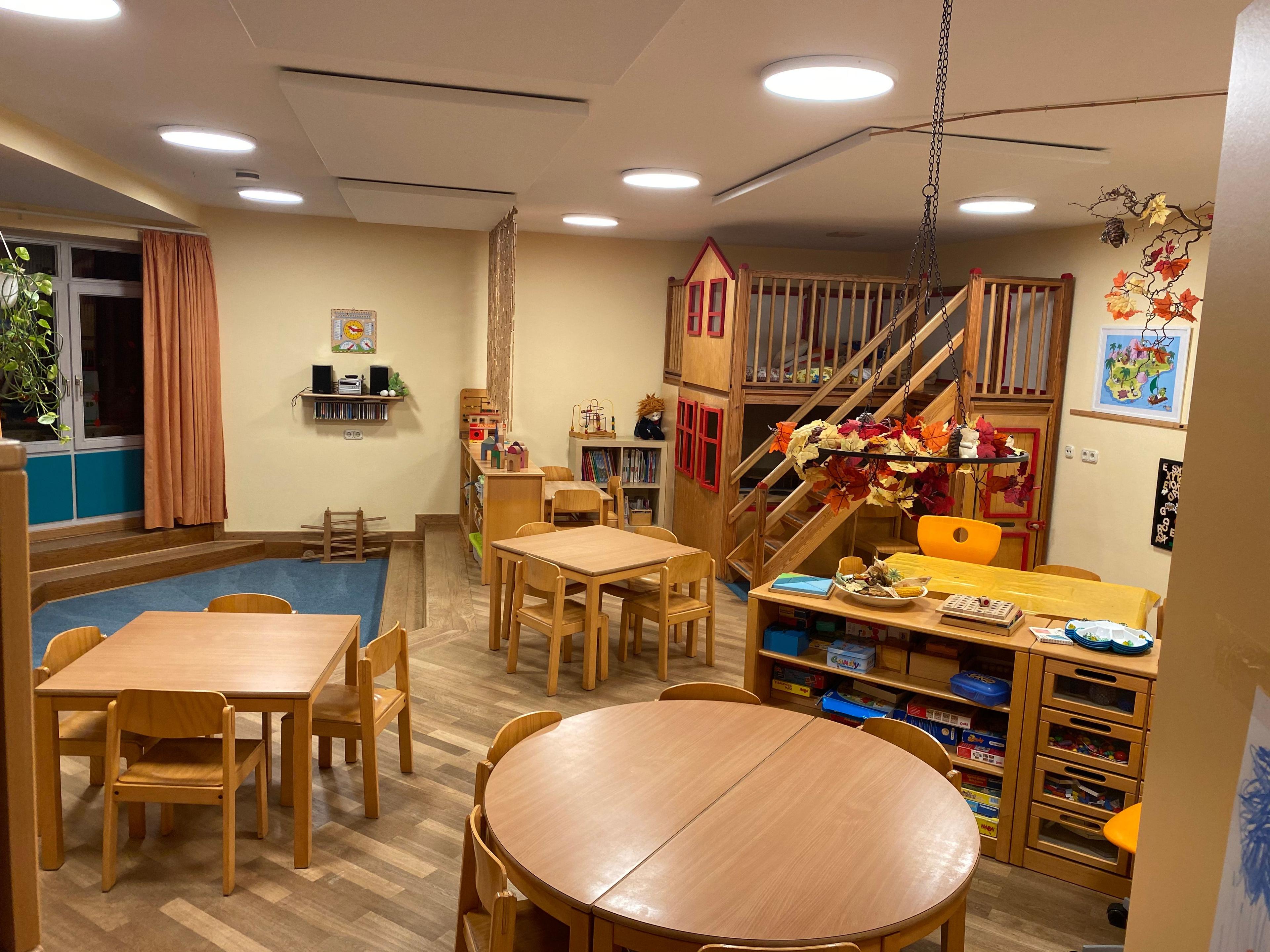 Unser Kindergarten hat drei Gruppenräume, einen Rollenspielraum, einen Bauraum, ein Traumland, einen Speiseraum und eine große Eingangshalle, in der sich der Kreativbereich und die Elternsitzgruppe befinden. Ferner gibt es im Keller unsere großzügig gestaltete Turnhalle sowie ein Zimmer, das als Therapieraum für die Integrationskinder und für Kleingruppenarbeit genutzt wird. Außerdem befinden sich im Keller ein Materialraum und eine Waschküche.